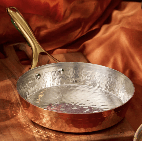 Generated premium, high-detail product visuals of the hammered copper frypan.